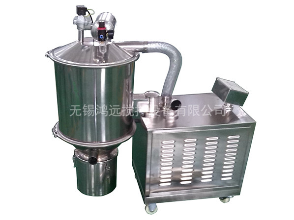 真空上料機由真空泵(無油、無水)或者羅茨風機、不銹鋼吸料嘴、輸送軟管、PE過濾器(或316L不銹鋼過濾器)、壓縮空氣反吹裝置、氣動放料門裝置、真空料斗和料位自動控制裝置等組成,整套系統設計合理、制造精良。